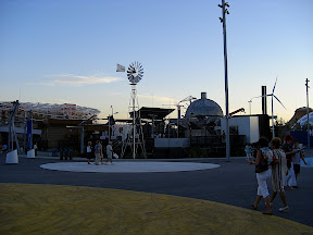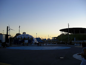 Yesterday, however, after lecture, we had a free day. I went right back upstairs and took some down time. I did all my laundry (energy and water efficiently by hand) and organised some things. Michelle and I had plans to go to the Expo and stay into the night. She was very patient with me, as I tend not to be so great at being on time with social events, and waited for me to do laundry and whatnot. She got to use my computer, too, which helped. Right before we left, I asked her if she had her ticket, and when it was discovered that she did not, she went to tear her room apart looking for it. She couldn't find it, so we tried to orchestrate using someone's bracelet (hard to break off) and ticket for re-entry so that she could do, but to little avail. People were down at the pool, and we went to ask them, only to sort of degrade into deciding to lay out in the sun for a while. Alejandro was nice enough to let Michelle have his ticket, which hadn't even been used for its third day, so our problem was solved. After more of my lying around by the pool and Michelle's patient impatience, we changed and left for the Expo with plans to meet everyone around 2230 for this Zaragoza Love night show or something. The Expo proved to be quite nice at night: not too hot, light until 2300 (o, Spain), but crowded with the people who buy the cheaper tickets for only past 2000. The following pictures were taken at 2118, and you can tell that the sun is setting, but still up.