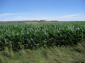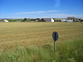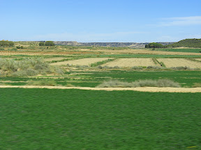 Driving around the desert, then, on a sleepy siesta, we saw some of the landscape. Nana, you would have been just ecstatic over the bridges. Little villages appeared out of nowhere. I even saw a lake, which seemed odd for a second, and then I realised that I haven't seen any at all here. This, actually, is more likely a reservoir. We passed irrigated fields (note the sprinklers in some of the pictures) of corn that made my stomach turn. First, corn does not belong in such quantities in Spain. Second, all of this corn you see is for starving people. I mean that not in the sense that it is to be used to feed these starving people, but in the sense that its purpose is to starve people. It's animal feed, and I nearly blanched thinking about how many people could live off the amount of grain that even one cow eats in a day. So wasteful, so depressing.